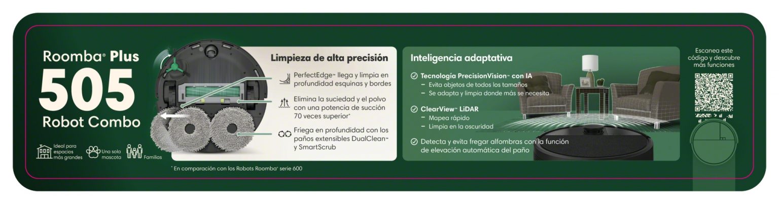 Con la Roomba Combo 505 Plus, mantener tu casa limpia ya no requiere esfuerzo ni tiempo extra. Gracias a su tecnología avanzada y su diseño todo en uno, este robot trabaja por ti, permitiéndote disfrutar de un ambiente impecable cada día, sin levantar un dedo. Es la opción perfecta para quienes valoran la comodidad, la eficiencia y una limpieza realmente completa.