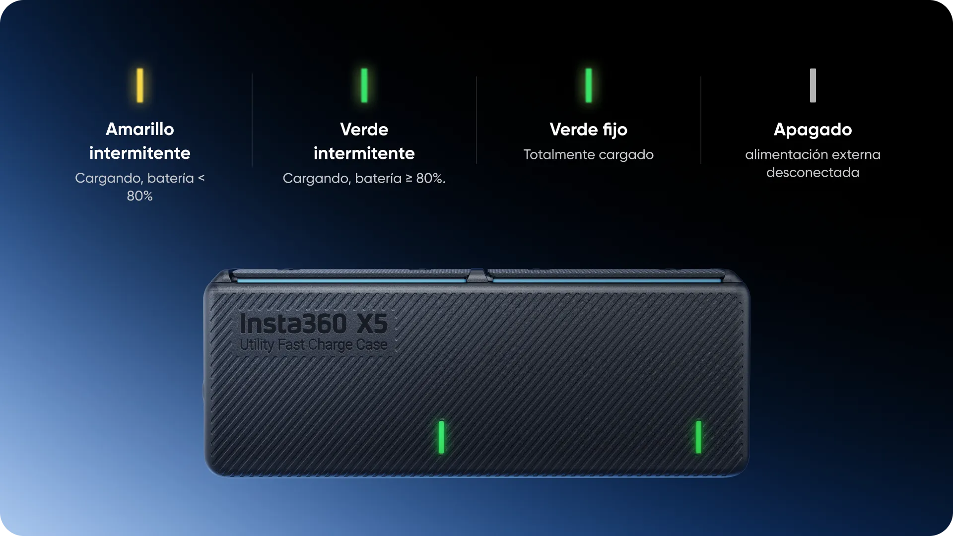 * Por razones de seguridad, la potencia de carga se reduce cuando se cargan simultáneamente las dos baterías y la Insta360 X5 a través del estuche. Recomendamos esta configuración sólo cuando no sea necesaria la carga rápida. Para una carga más rápida, conecta una fuente de alimentación externa directamente a la X5.