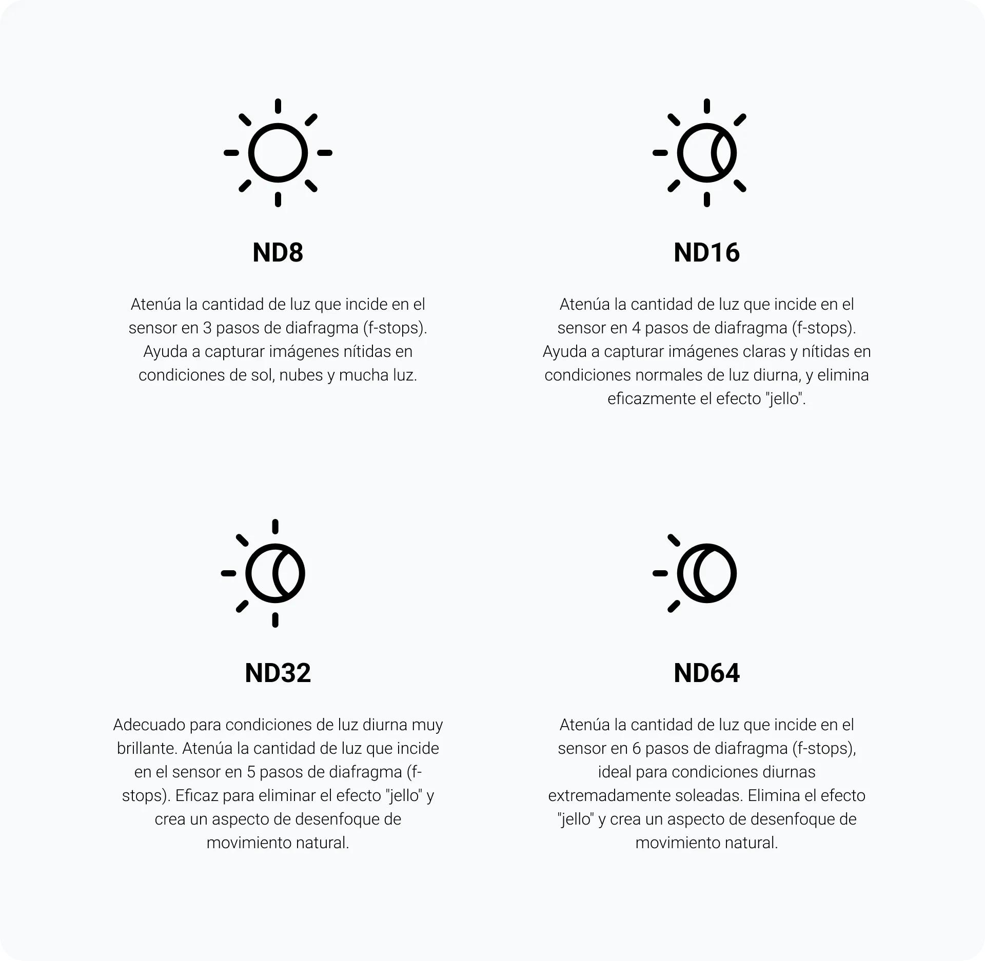 - 1x Filtro ND8 - 1x Filtro ND16 - 1x Filtro ND32 - 1x Filtro ND64 |