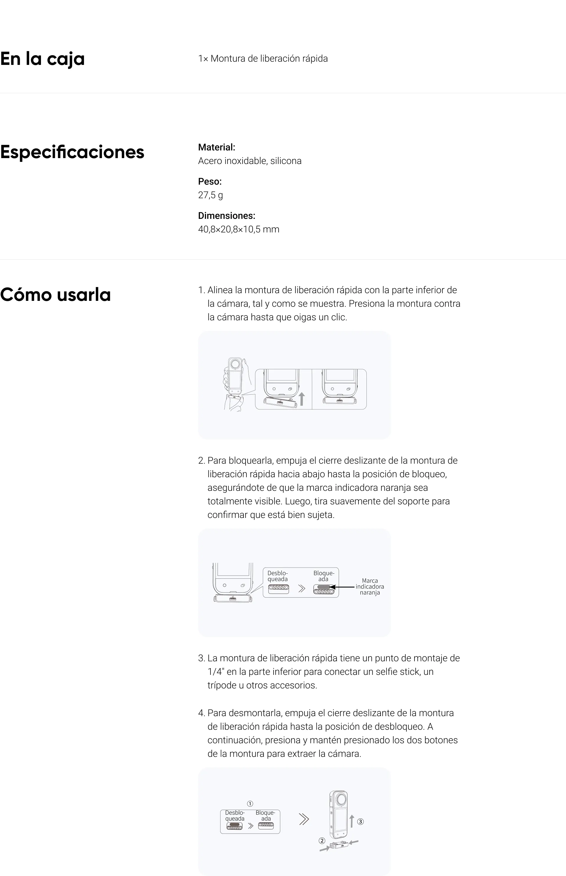 Dispone de un punto de montaje de 1/4", compatible con trípodes y accesorios estándar.